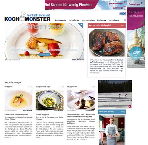 www.kochmonster.de war 2009 Deutschlands erstes Koch- und Genussportal für Männer und andere Intensivkocher. Kochmonster bietet u.a. mehr als 1.200 von Berufsköchen geprüfte Kochrezepte und hat inzwischen die mit Abstand meisten Sternekoch-Rezepte von allen deutschsprachigen Genussportalen. Kochmonster erreicht aktuell monatlich mehr als 70.000 Leser und hat über 10.000 namentlich registrierte Nutzer.
